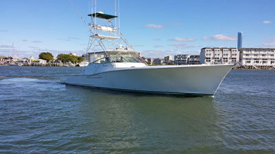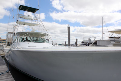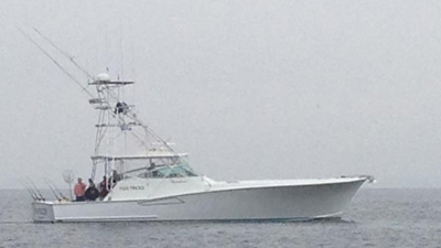 The "Fish Tricks" is a 57 x 17 ft. Gillman sportfishing machine, powered by twin 800 hp Caterpillar Diesels. Capable of cruising at 30 knots, she has a huge cockpit with fighting chair, transom door, saltwater washdown and 50 gallon live well. Two steps up from the cockpit you'll find the air conditioned express bridge with helm seating for three. To port on the bridge there's a day sofa, and to starboard is deep bait freezer and sink-prep station. The helm also features a full complement of the newest in touch screen electronics (LORAN, depth finder, 72 mile RADAR, GPS / plotter), synchronizer, SSB radio, two VHFs, with an EPIRB on the hardtop, and Sirius XM Radio.