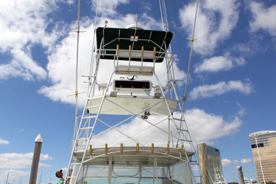 The tuna tower offers bench seating facing forward, two individual seats facing aft, Furuno electronics, and engine and anchor controls.